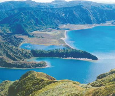 z. B. von 900 m Höhe auf den „Lagoa do Fogo" (Feuersee), der Panoramablick auf
